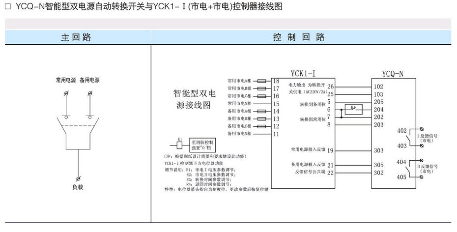 YCQ-N智能型雙電源自動(dòng)轉(zhuǎn)換開關(guān)主要用于供電系統(tǒng)中由YCK1-Ⅰ外帶控制器對(duì)雙電源開關(guān)進(jìn)行轉(zhuǎn)換控制,以及對(duì)電源電壓、電源頻率進(jìn)行檢測(cè),轉(zhuǎn)換時(shí)間可調(diào)節(jié),具有開關(guān)狀態(tài)及故障報(bào)警指示;緊急狀態(tài)下由近距離或遠(yuǎn)程遙控對(duì)開關(guān)進(jìn)行強(qiáng)制置零。