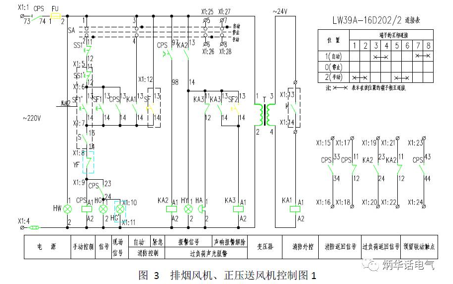 圖3是排煙風(fēng)機(jī)和正壓送風(fēng)機(jī)控制圖,其主回路參見圖1b,為CPS方案,適合于交流380V單臺消防排煙風(fēng)機(jī)或正壓送風(fēng)機(jī)的現(xiàn)場控制或兩地控制,過載保護(hù)只報(bào)警,風(fēng)口(或風(fēng)閥)上的微動開關(guān)直接與風(fēng)機(jī)聯(lián)動,消防聯(lián)動模塊提供無源動合觸點(diǎn),當(dāng)消防系統(tǒng)提供有源觸點(diǎn)時(shí),取消變壓器T。只有現(xiàn)場控制時(shí),取消SS1'、SF1'、S、HG'并將X1:5與X1:6短接,X1:6與X1:7斷開,X1:7與X1:8短接,X1:10與X1:11斷開。圖中CPS包含線圈、過載保護(hù)觸點(diǎn),動合觸點(diǎn)、動斷觸點(diǎn)。用于正壓送風(fēng)機(jī)控制時(shí),將X1:8與X1:9短接。