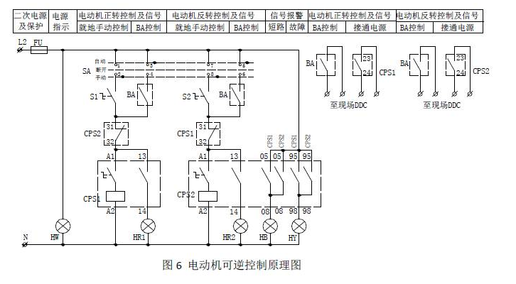 圖5和圖6分別為CPS組成的電動機(jī)可逆控制的主回路和二次原理圖,CPS1、CPS2分別控制電動機(jī)正轉(zhuǎn)和反轉(zhuǎn)的線圈,集成在CPS內(nèi),類似分立元件構(gòu)成電動機(jī)主回路中的接觸器,CPS本身具有機(jī)械聯(lián)鎖功能,正反轉(zhuǎn)的動斷觸點(diǎn)分別串聯(lián)在對方的線圈回路,形成電氣聯(lián)鎖。本方案還具有BA自動控制功能。